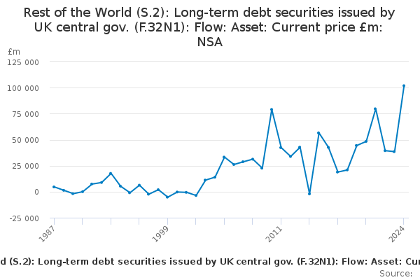 Download this time seriesRest of the World (S.2): Long-term debt securities issued by UK central gov. (F.32N1): Flow: Asset: Current price £m: NSA