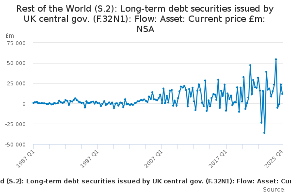 Download this time seriesRest of the World (S.2): Long-term debt securities issued by UK central gov. (F.32N1): Flow: Asset: Current price £m: NSA