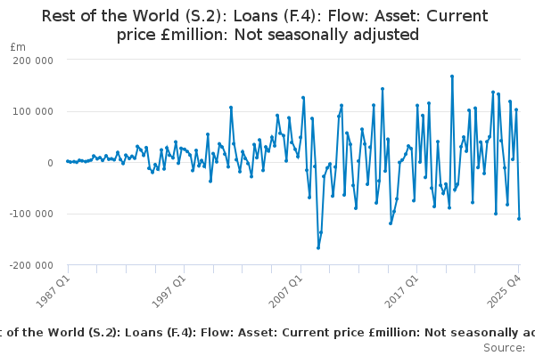 Download this time seriesRest of the World (S.2): Loans (F.4): Flow: Asset: Current price £million: Not seasonally adjusted