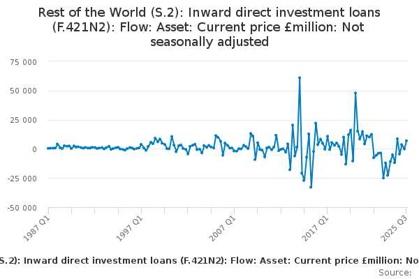 Download this time seriesRest of the World (S.2): Inward direct investment loans (F.421N2): Flow: Asset: Current price £million: Not seasonally adjusted