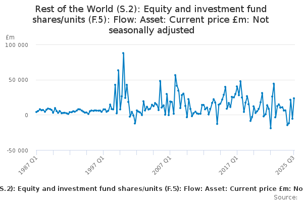 Download this time seriesRest of the World (S.2): Equity and investment fund shares/units (F.5): Flow: Asset: Current price £m: Not seasonally adjusted