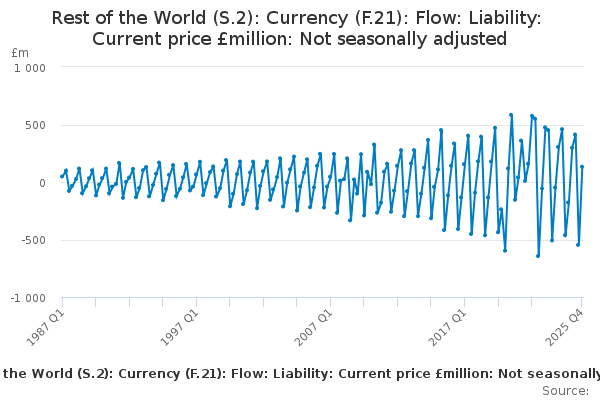 Download this time seriesRest of the World (S.2): Currency (F.21): Flow: Liability: Current price £million: Not seasonally adjusted