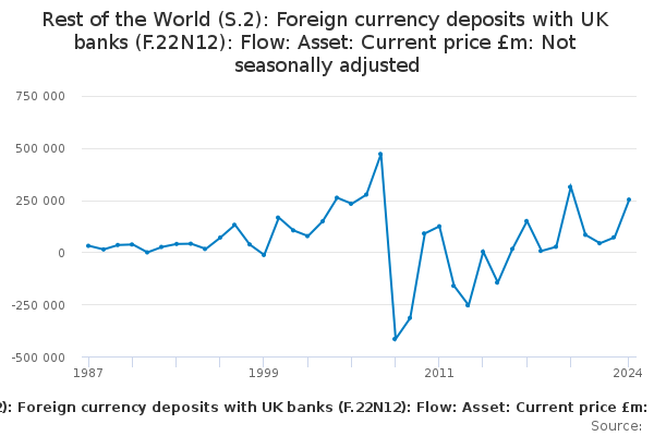 Download this time seriesRest of the World (S.2): Foreign currency deposits with UK banks (F.22N12): Flow: Asset: Current price £m: Not seasonally adjusted
