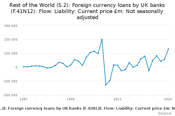 Download this time seriesRest of the World (S.2): Foreign currency loans by UK banks (F.41N12): Flow: Liability: Current price £m: Not seasonally adjusted