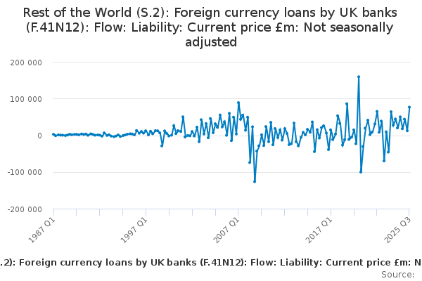 Download this time seriesRest of the World (S.2): Foreign currency loans by UK banks (F.41N12): Flow: Liability: Current price £m: Not seasonally adjusted
