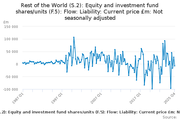 Download this time seriesRest of the World (S.2): Equity and investment fund shares/units (F.5): Flow: Liability: Current price £m: Not seasonally adjusted