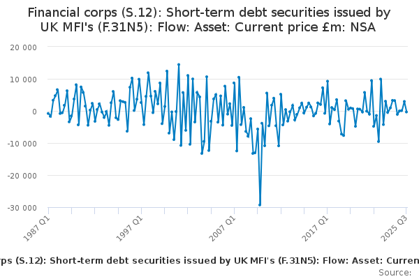 Download this time seriesFinancial corps (S.12): Short-term debt securities issued by UK MFI's (F.31N5): Flow: Asset: Current price £m: NSA