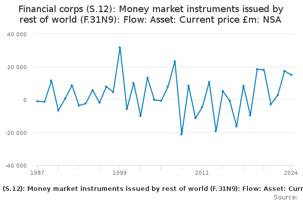 Download this time seriesFinancial corps (S.12): Money market instruments issued by rest of world (F.31N9): Flow: Asset: Current price £m: NSA