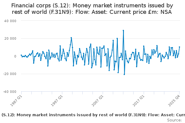 Download this time seriesFinancial corps (S.12): Money market instruments issued by rest of world (F.31N9): Flow: Asset: Current price £m: NSA