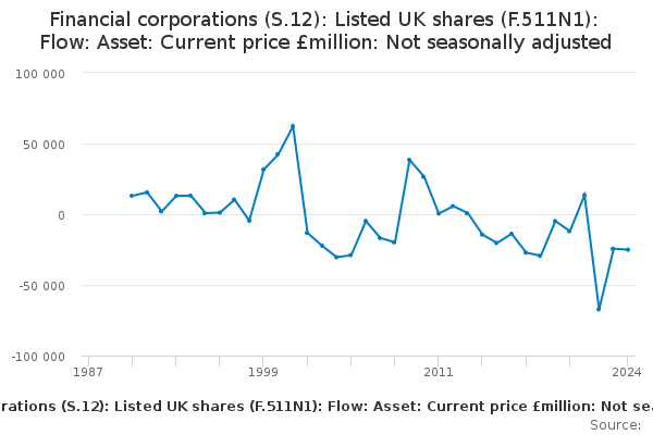 Download this time seriesFinancial corporations (S.12): Listed UK shares (F.511N1): Flow: Asset: Current price £million: Not seasonally adjusted