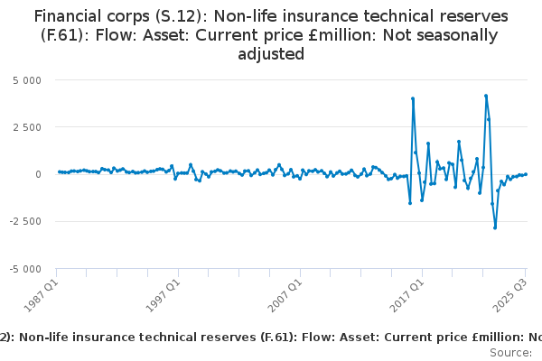 Download this time seriesFinancial corps (S.12): Non-life insurance technical reserves (F.61): Flow: Asset: Current price £million: Not seasonally adjusted