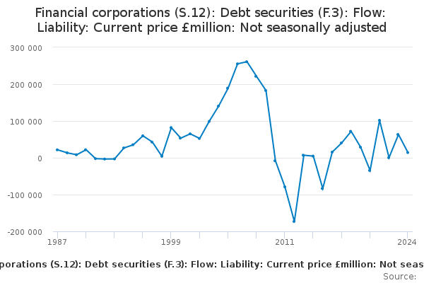 Download this time seriesFinancial corporations (S.12): Debt securities (F.3): Flow: Liability: Current price £million: Not seasonally adjusted