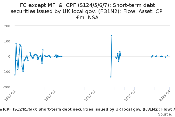 Download this time seriesFC except MFI & ICPF (S124/5/6/7): Short-term debt securities issued by UK local gov. (F.31N2): Flow: Asset: CP £m: NSA
