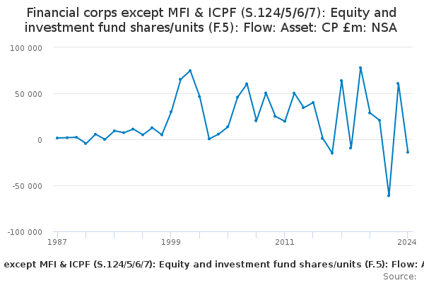 Download this time seriesFinancial corps except MFI & ICPF (S.124/5/6/7): Equity and investment fund shares/units (F.5): Flow: Asset: CP £m: NSA