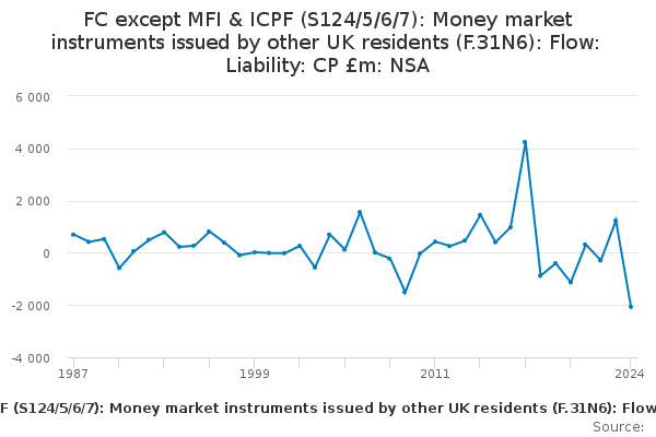 Download this time seriesFC except MFI & ICPF (S124/5/6/7): Money market instruments issued by other UK residents (F.31N6): Flow: Liability: CP £m: NSA