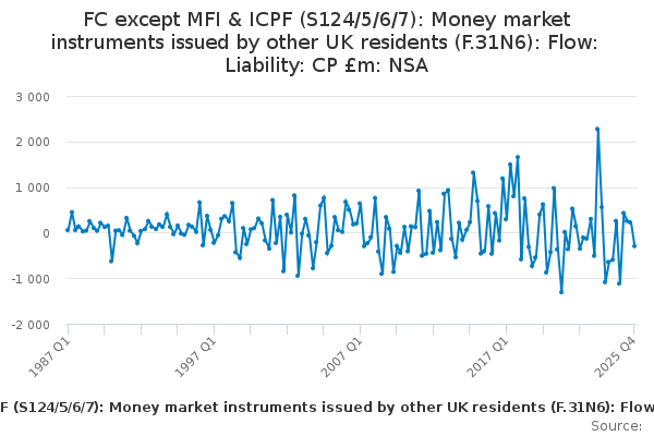 Download this time seriesFC except MFI & ICPF (S124/5/6/7): Money market instruments issued by other UK residents (F.31N6): Flow: Liability: CP £m: NSA