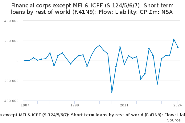 Download this time seriesFinancial corps except MFI & ICPF (S.124/5/6/7): Short term loans by rest of world (F.41N9): Flow: Liability: CP £m: NSA