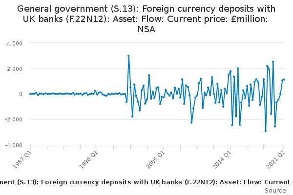 Download this time seriesGeneral government (S.13): Foreign currency deposits with UK banks (F.22N12): Asset: Flow: Current price: £million: NSA