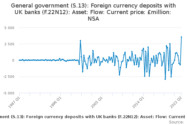 Download this time seriesGeneral government (S.13): Foreign currency deposits with UK banks (F.22N12): Asset: Flow: Current price: £million: NSA