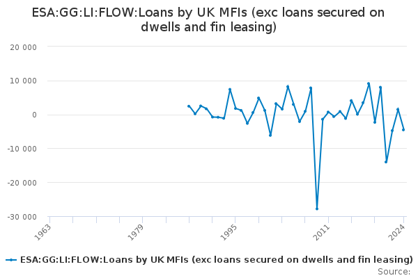 Download this time seriesESA:GG:LI:FLOW:Loans by UK MFIs (exc loans secured on dwells and fin leasing)