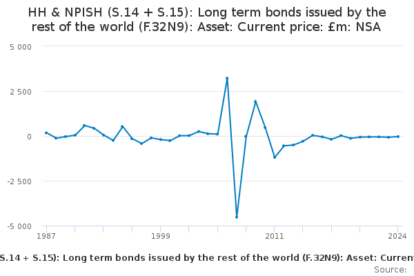 Download this time seriesHH & NPISH (S.14 + S.15): Long term bonds issued by the rest of the world (F.32N9): Asset: Current price: £m: NSA