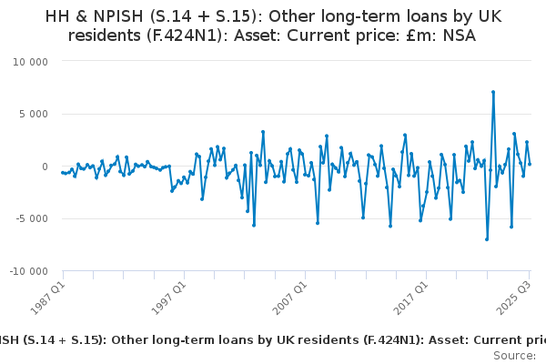 Download this time seriesHH & NPISH (S.14 + S.15): Other long-term loans by UK residents (F.424N1): Asset: Current price: £m: NSA