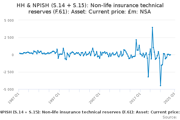 Download this time seriesHH & NPISH (S.14 + S.15): Non-life insurance technical reserves (F.61): Asset: Current price: £m: NSA