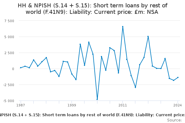 Download this time seriesHH & NPISH (S.14 + S.15): Short term loans by rest of world (F.41N9): Liability: Current price: £m: NSA