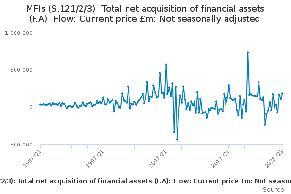 Download this time seriesMFIs (S.121/2/3): Total net acquisition of financial assets (F.A): Flow: Current price £m: Not seasonally adjusted