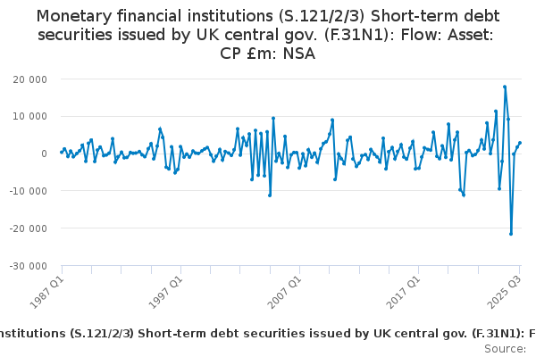 Download this time seriesMonetary financial institutions (S.121/2/3) Short-term debt securities issued by UK central gov. (F.31N1): Flow: Asset: CP £m: NSA
