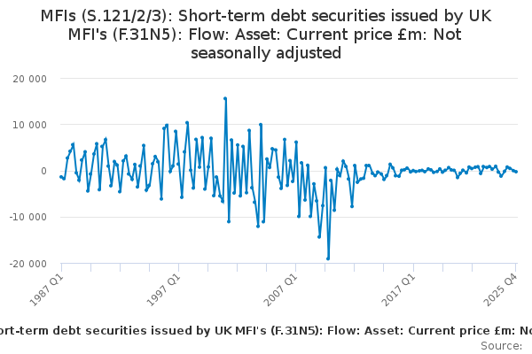 Download this time seriesMFIs (S.121/2/3): Short-term debt securities issued by UK MFI's (F.31N5): Flow: Asset: Current price £m: Not seasonally adjusted