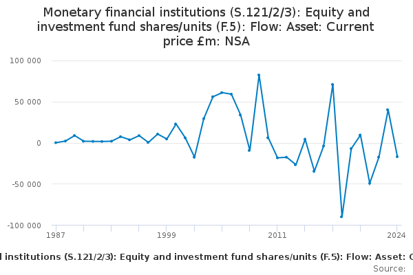 Download this time seriesMonetary financial institutions (S.121/2/3): Equity and investment fund shares/units (F.5): Flow: Asset: Current price £m: NSA