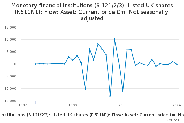 Download this time seriesMonetary financial institutions (S.121/2/3): Listed UK shares (F.511N1): Flow: Asset: Current price £m: Not seasonally adjusted
