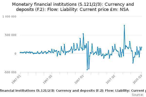 Download this time seriesMonetary financial institutions (S.121/2/3): Currency and deposits (F.2): Flow: Liability: Current price £m: NSA