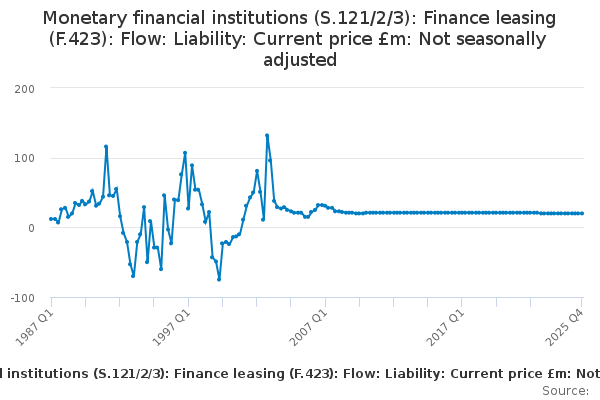 Download this time seriesMonetary financial institutions (S.121/2/3): Finance leasing (F.423): Flow: Liability: Current price £m: Not seasonally adjusted