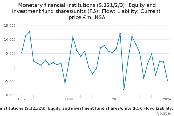 Download this time seriesMonetary financial institutions (S.121/2/3): Equity and investment fund shares/units (F.5): Flow: Liability: Current price £m: NSA