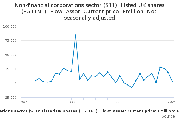 Download this time seriesNon-financial corporations sector (S11): Listed UK shares (F.511N1): Flow: Asset: Current price: £million: Not seasonally adjusted