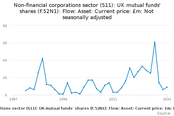 Download this time seriesNon-financial corporations sector (S11): UK mutual funds' shares (F.52N1): Flow: Asset: Current price: £m: Not seasonally adjusted