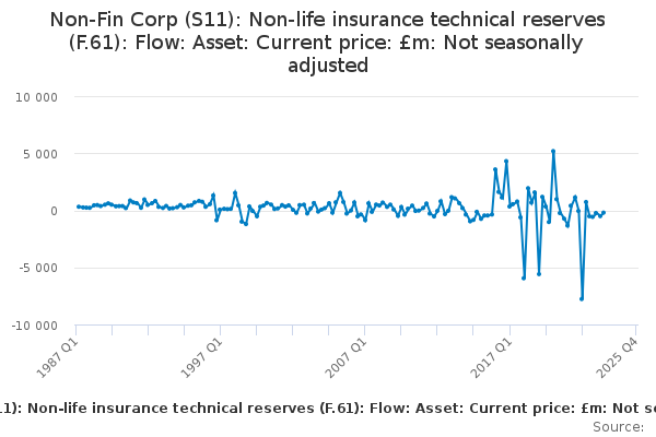 Download this time seriesNon-Fin Corp (S11): Non-life insurance technical reserves (F.61): Flow: Asset: Current price: £m: Not seasonally adjusted