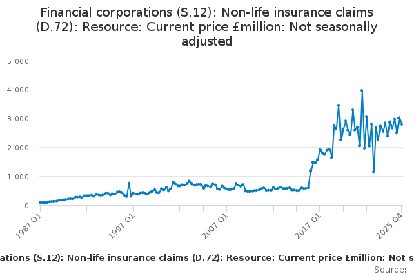 Download this time seriesFinancial corporations (S.12): Non-life insurance claims (D.72): Resource: Current price £million: Not seasonally adjusted