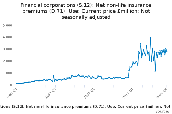 Download this time seriesFinancial corporations (S.12): Net non-life insurance premiums (D.71): Use: Current price £million: Not seasonally adjusted