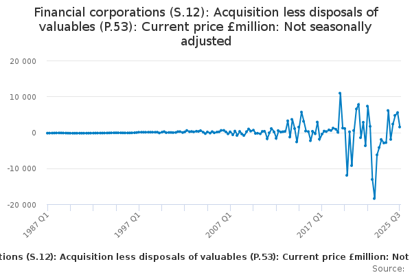 Download this time seriesFinancial corporations (S.12): Acquisition less disposals of valuables (P.53): Current price £million: Not seasonally adjusted
