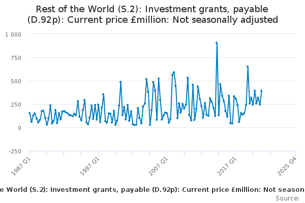 Download this time seriesRest of the World (S.2): Investment grants, payable (D.92p): Current price £million: Not seasonally adjusted
