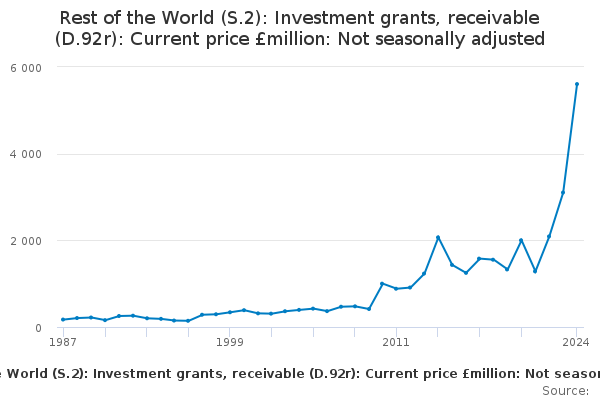 Download this time seriesRest of the World (S.2): Investment grants, receivable (D.92r): Current price £million: Not seasonally adjusted