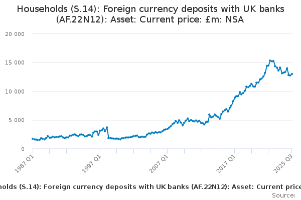 Download this time seriesHouseholds (S.14): Foreign currency deposits with UK banks (AF.22N12): Asset: Current price: £m: NSA