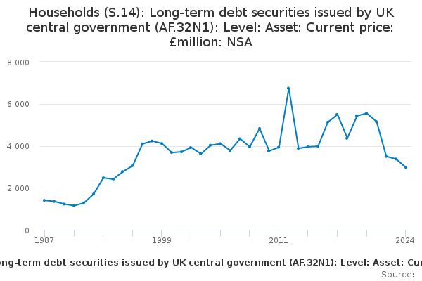 Download this time seriesHouseholds (S.14): Long-term debt securities issued by UK central government (AF.32N1): Level: Asset: Current price: £million: NSA