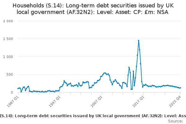 Download this time seriesHouseholds (S.14): Long-term debt securities issued by UK local government (AF.32N2): Level: Asset: CP: £m: NSA