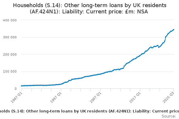 Download this time seriesHouseholds (S.14): Other long-term loans by UK residents (AF.424N1): Liability: Current price: £m: NSA
