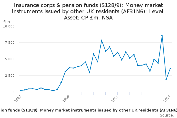 Download this time seriesInsurance corps & pension funds (S128/9): Money market instruments issued by other UK residents (AF31N6): Level: Asset: CP £m: NSA