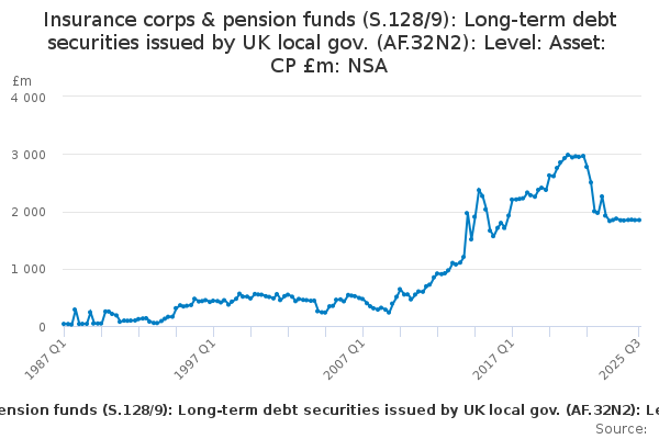 Download this time seriesInsurance corps & pension funds (S.128/9): Long-term debt securities issued by UK local gov. (AF.32N2): Level: Asset: CP £m: NSA